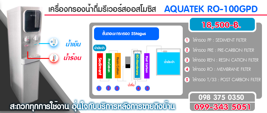 ผเครื่องกรงน้ำAQUATEK RO100GPD แบบตู้กดน้ำร้อยน้ำเย็นระบบรีเวอร์ออสโมซิส (Reverse Osmosis Dringking Water System)